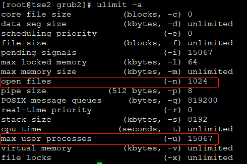 [root@tse2 grub2]# vim /etc/security/limits.conf * soft nproc 65535 * hard nproc 65535 * soft nofile 65535 * hard nofile 65535