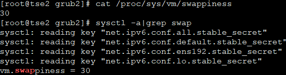 [root@tse2 grub2]# cat /proc/sys/vm/swappiness 30 [root@tse2 grub2]# sysctl -a|grep swap sysctl: reading key "net.ipv6.conf.all.stable_secret" sysctl: reading key "net.ipv6.conf.default.stable_secret" sysctl: reading key "net.ipv6.conf.ens192.stable_secret" sysctl: reading key "net.ipv6.conf.lo.stable_secret" vm.swappiness = 30