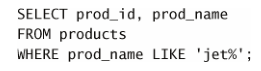 此例子使用了搜索模式 'jet%' 。在执行这条子句时,将检索任