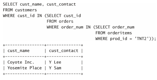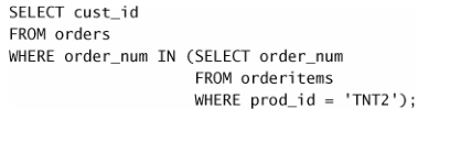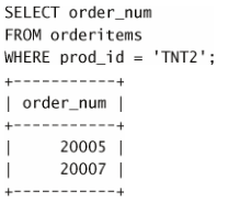第一条 SELECT 语句的含义很明确,对于 prod_id 为 TNT2 的所有订单物