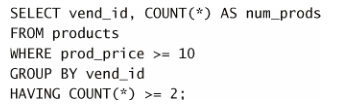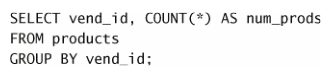 num_prods 为计算字段(用 COUNT(*) 函数建立)。 GROUP BY 子句指