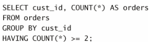 HAVING 子句,它过滤 COUNT(*) >=2 (两个以上的订单)的那些