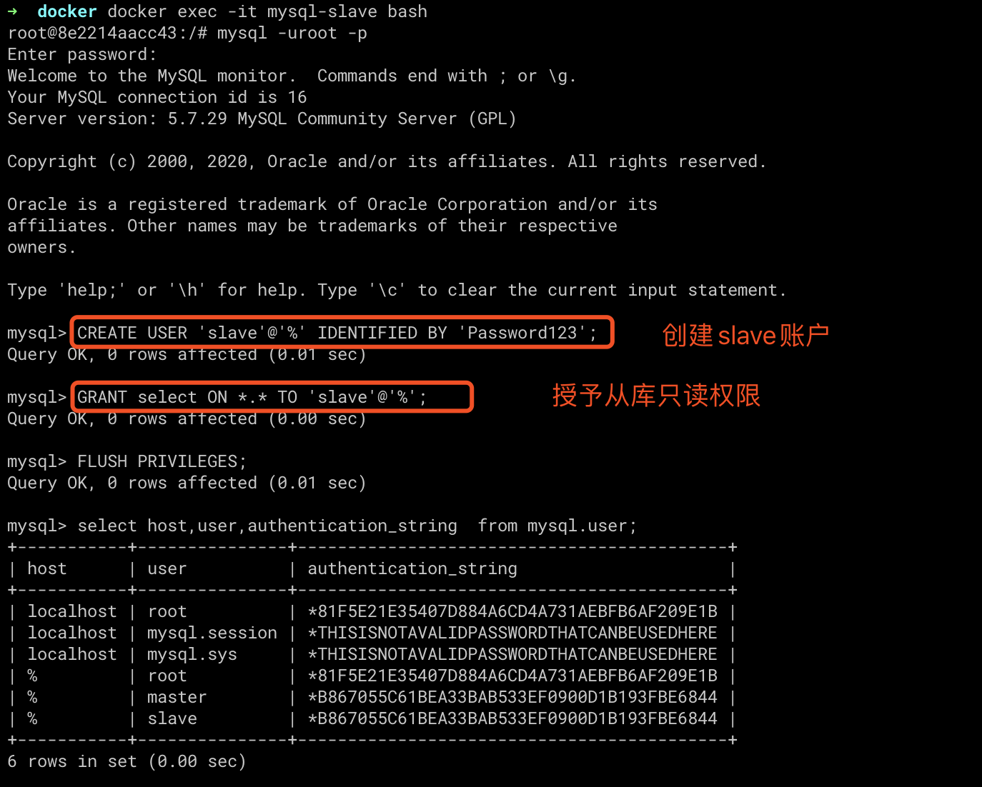 CREATE USER 'slave'@'%' IDENTIFIED BY 'Password123';