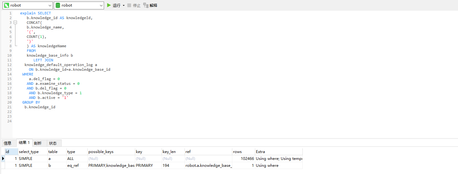查看knowledge_default_operation_log表发现数据10多万条,knowledge_base_info表1万多条,由第第一张图可以明显的看出knowledge_default_operation_log表没有走索引,查看该表发现knowledge_base_id字段上有索引,怎么回事?