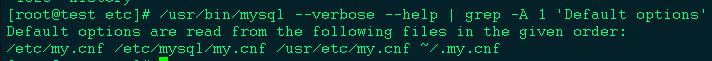 /usr/bin/mysql --verbose --help | grep -A 1 'Default options'