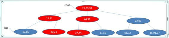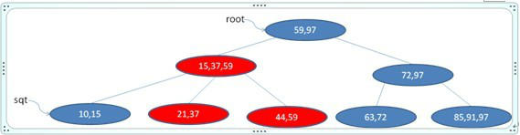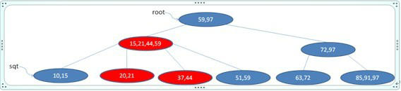 发现父节点也破坏了B+树的性质,则把之再分解成[15 21], [44 59]两个,并把21往其父节点移,如下图