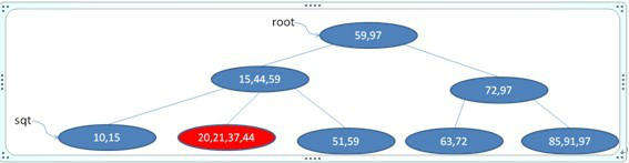 发现第二个叶子节点已经破坏了B+树的性质,则把之分解成[20 21], [37 44]两个,并把21往父节点移,如下图