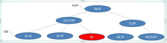 破坏了B+树的性质,从该节点的兄弟节点(左边或右边)借节点44,并修改相应键值,判断没有破坏B+树,完毕,如下图