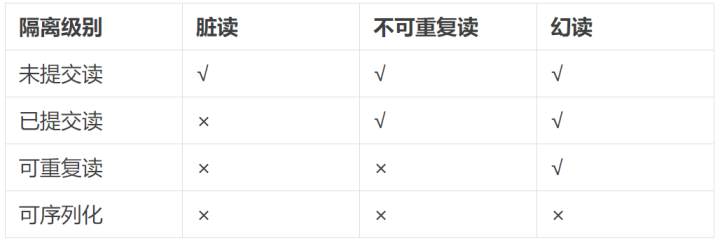 若锁的操作要用户自己控制,会比较复杂,因此数据库管理系统提供了事务的隔离级别,使问题简单化。MySQL的隔离级别有四种,分别是:未提交读、已提交读、可重复读、可序列化。它们与并发一致性问题的关系如下表所示。MySQL默认隔离级别为:可重复读