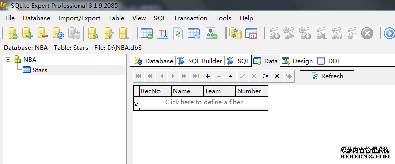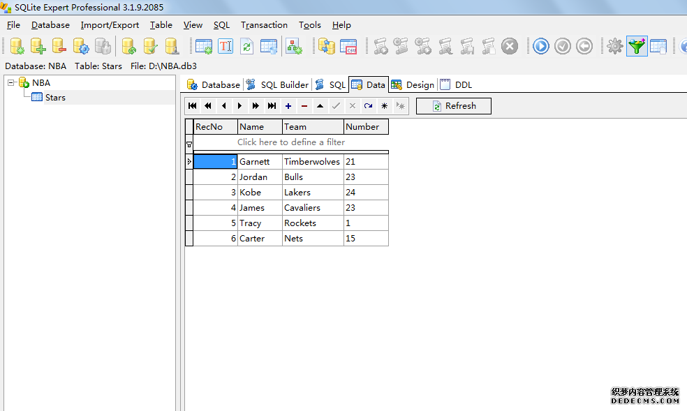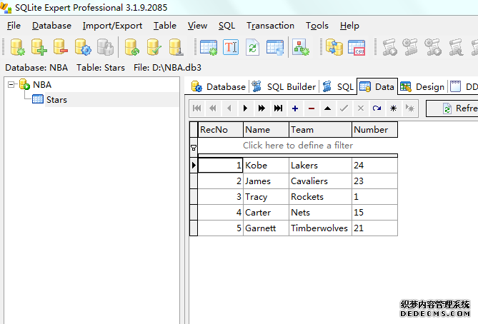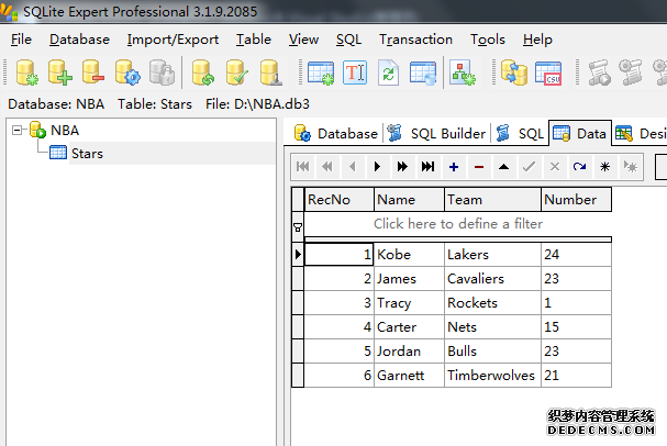 看下效果,数据库文件NBA的表Stars中有Name,Team和Number字段