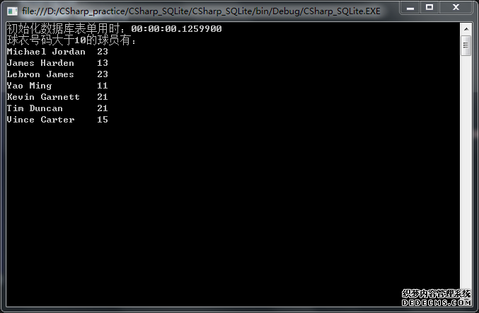 1 using System; 2 using System.Collections.Generic; 3 using System.Data.SQLite; 4 using System.Data; 5 using System.IO; 6 using System.Data.Common; 7 using System.Diagnostics; 8 9 10 namespace CSharp_SQLite 11 { 12 class Program 13 { 14 15 static void Main(string[] args) 16 { 17 string dbPath = "NBAStars.nba"; 18 Stopwatch timer = new Stopwatch(); 19 timer.Start(); 20 CSQLiteHelper sqlhelper = new CSQLiteHelper(dbPath); 21 sqlhelper.OpenDbConn(); 22 sqlhelper.BeginTransaction(); 23 sqlhelper.ExecuteNonQuery("delete from Stars"); 24 #region 球员信息 25 sqlhelper.ExecuteNonQuery("insert into Stars (Name,Team,Number) values('Michael Jordan','Bulls','23')"); 26 sqlhelper.ExecuteNonQuery("insert into Stars (Name,Team,Number) values('James Harden','Rockets','13')"); 27 sqlhelper.ExecuteNonQuery("insert into Stars (Name,Team,Number) values('Lebron James','Cavaliers','23')"); 28 sqlhelper.ExecuteNonQuery("insert into Stars (Name,Team,Number) values('Tracy Mcgrady','Rockets','1')"); 29 sqlhelper.ExecuteNonQuery("insert into Stars (Name,Team,Number) values('Yao Ming','Rockets','11')"); 30 sqlhelper.ExecuteNonQuery("insert into Stars (Name,Team,Number) values('Kevin Garnett','Timberwolves','21')"); 31 sqlhelper.ExecuteNonQuery("insert into Stars (Name,Team,Number) values('Tim Duncan','Supers','21')"); 32 sqlhelper.ExecuteNonQuery("insert into Stars (Name,Team,Number) values('Vince Carter','Nets','15')"); 33 sqlhelper.ExecuteNonQuery("insert into Stars (Name,Team,Number) values('Michael Carter Williams','76ers','10')"); 34 #endregion 35 sqlhelper.Commit(); 36 sqlhelper.CloseDbConn(); 37 timer.Stop(); 38 Console.WriteLine("初始化数据库表单用时:" + timer.Elapsed); 39 40 41 CSQLiteHelper sqlHelper = new CSQLiteHelper(dbPath); 42 sqlHelper.OpenDbConn(); 43 sqlHelper.BeginTransaction(); 44 DataTable dt = sqlHelper.Query("select Name, Number from Stars where Number > 10").Tables[0]; 45 sqlHelper.Commit(); 46 sqlHelper.CloseDbConn(); 47 Console.WriteLine("球衣号码大于10的球员有:"); 48 for (int i = 0; i < dt.Rows.Count; i++) 49 { 50 Console.WriteLine(dt.Rows[i]["Name"] + "\t" + dt.Rows[i]["Number"]); 51 } 52 Console.ReadLine(); 53 } 54 55 } 56 57 }