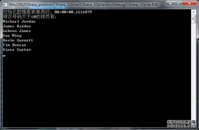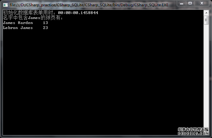 1 using System; 2 using System.Collections.Generic; 3 using System.Data.SQLite; 4 using System.Data; 5 using System.IO; 6 using System.Data.Common; 7 using System.Diagnostics; 8 9 10 namespace CSharp_SQLite 11 { 12 class Program 13 { 14 15 static void Main(string[] args) 16 { 17 string dbPath = "NBAStars.nba"; 18 Stopwatch timer = new Stopwatch(); 19 timer.Start(); 20 CSQLiteHelper sqlhelper = new CSQLiteHelper(dbPath); 21 sqlhelper.OpenDbConn(); 22 sqlhelper.BeginTransaction(); 23 sqlhelper.ExecuteNonQuery("delete from Stars"); 24 #region 球员信息 25 sqlhelper.ExecuteNonQuery("insert into Stars (Name,Team,Number) values('Michael Jordan','Bulls','23')"); 26 sqlhelper.ExecuteNonQuery("insert into Stars (Name,Team,Number) values('James Harden','Rockets','13')"); 27 sqlhelper.ExecuteNonQuery("insert into Stars (Name,Team,Number) values('Lebron James','Cavaliers','23')"); 28 sqlhelper.ExecuteNonQuery("insert into Stars (Name,Team,Number) values('Tracy Mcgrady','Rockets','1')"); 29 sqlhelper.ExecuteNonQuery("insert into Stars (Name,Team,Number) values('Yao Ming','Rockets','11')"); 30 sqlhelper.ExecuteNonQuery("insert into Stars (Name,Team,Number) values('Kevin Garnett','Timberwolves','21')"); 31 sqlhelper.ExecuteNonQuery("insert into Stars (Name,Team,Number) values('Tim Duncan','Supers','21')"); 32 sqlhelper.ExecuteNonQuery("insert into Stars (Name,Team,Number) values('Vince Carter','Nets','15')"); 33 sqlhelper.ExecuteNonQuery("insert into Stars (Name,Team,Number) values('Michael Carter Williams','76ers','10')"); 34 #endregion 35 sqlhelper.Commit(); 36 sqlhelper.CloseDbConn(); 37 timer.Stop(); 38 Console.WriteLine("初始化数据库表单用时:" + timer.Elapsed); 39 40 41 CSQLiteHelper sqlHelper = new CSQLiteHelper(dbPath); 42 sqlHelper.OpenDbConn(); 43 sqlHelper.BeginTransaction(); 44 DataTable dt = sqlHelper.Query("select Name, Number from Stars where Name like '%James%'").Tables[0]; 45 sqlHelper.Commit(); 46 sqlHelper.CloseDbConn(); 47 Console.WriteLine("名字中包含James的球员有:"); 48 for (int i = 0; i < dt.Rows.Count; i++) 49 { 50 Console.WriteLine(dt.Rows[i]["Name"] + "\t" + dt.Rows[i]["Number"]); 51 } 52 Console.ReadLine(); 53 } 54 55 } 56 57 }