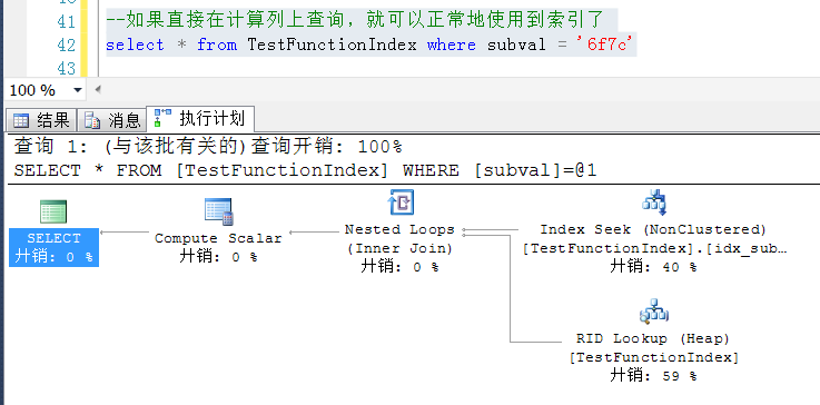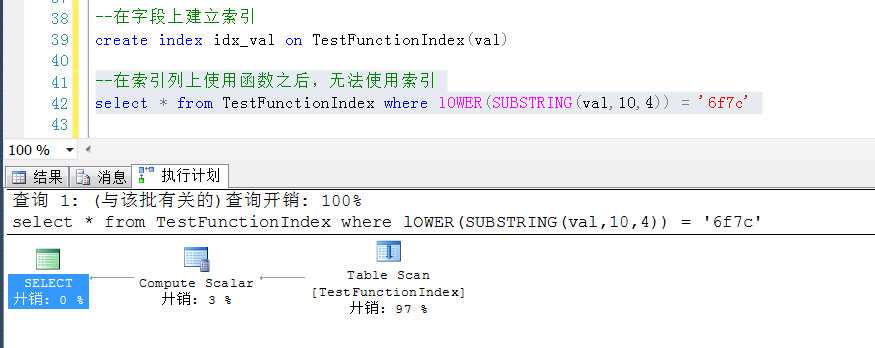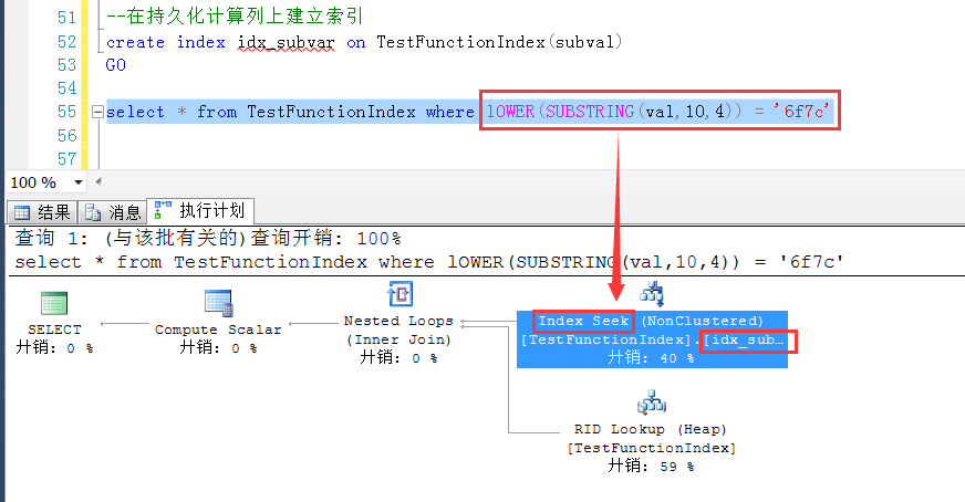 Create Table TestFunctionIndex ( id int identity(1,1), val varchar(50), subval as LOWER(SUBSTRING(val,10,4)) persisted --增加一个持久化计算列 ) GO --在持久化计算列上建立索引 create index idx_subvar on TestFunctionIndex(subval) GO --插入10W行测试数据 insert into TestFunctionIndex(val) values (NEWID()) go 100000