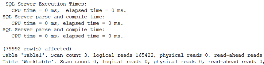 为了演示这个性能问题,接下来的查询我指定查询优化器使用特定的非聚集索引。查询本身返回80000行,因为对于每个查询执行,SQL Server需要进行书签查找80000次——反复执行。