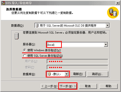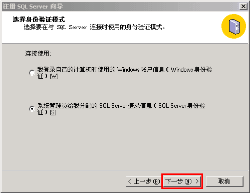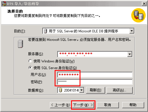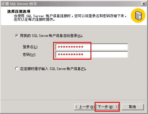 7、按下图所示,按您的订单中显示的SQL用户名和密码,分别填写后,点下一步;