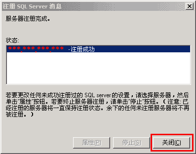 9、显示注册成功。(如果总是提示失败,请检查您的局域网是否开放了1433端口,同时检查您的SQL链接超时时间,SQL默认超时时间为4秒,建议改成60秒---在SQLserver企业管理器=>工具=>选项=>高级。)
