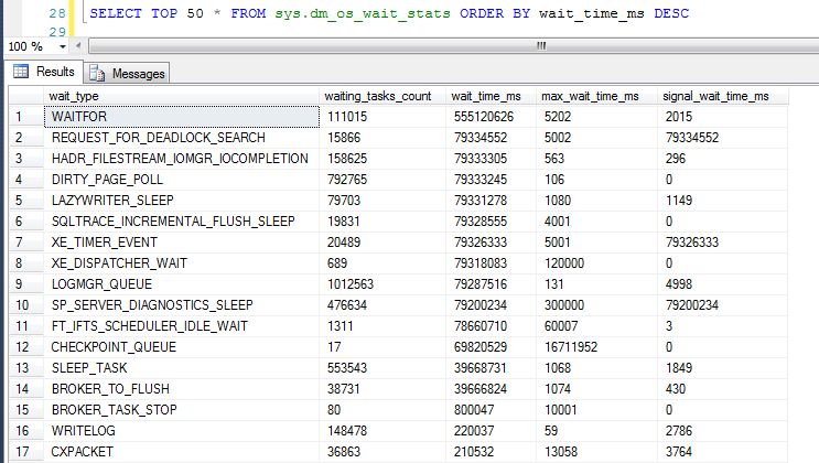 在SQL Server中有一个系统视图sys.dm_os_wait_stats记录了自数据库服务启动以来累积产生的等待信息,