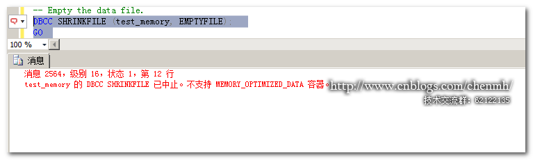---创建内存表文件组 ALTER DATABASE [test] ADD FILEGROUP [test_ag] CONTAINS MEMORY_OPTIMIZED_DATA GO ----创建内存表数据库文件 ALTER DATABASE [test] ADD FILE ( NAME = 'test_memory', FILENAME ='D:\database\memory' ) TO FILEGROUP [test_ag]; GO