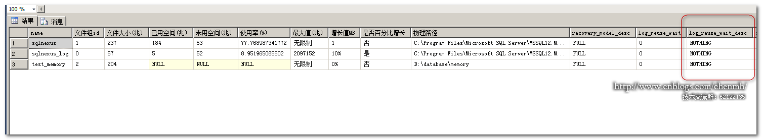 通过log_reuse_wait_desc的状态可以看到当前数据库已经无需日志备份,当然我已经执行过日志备份。