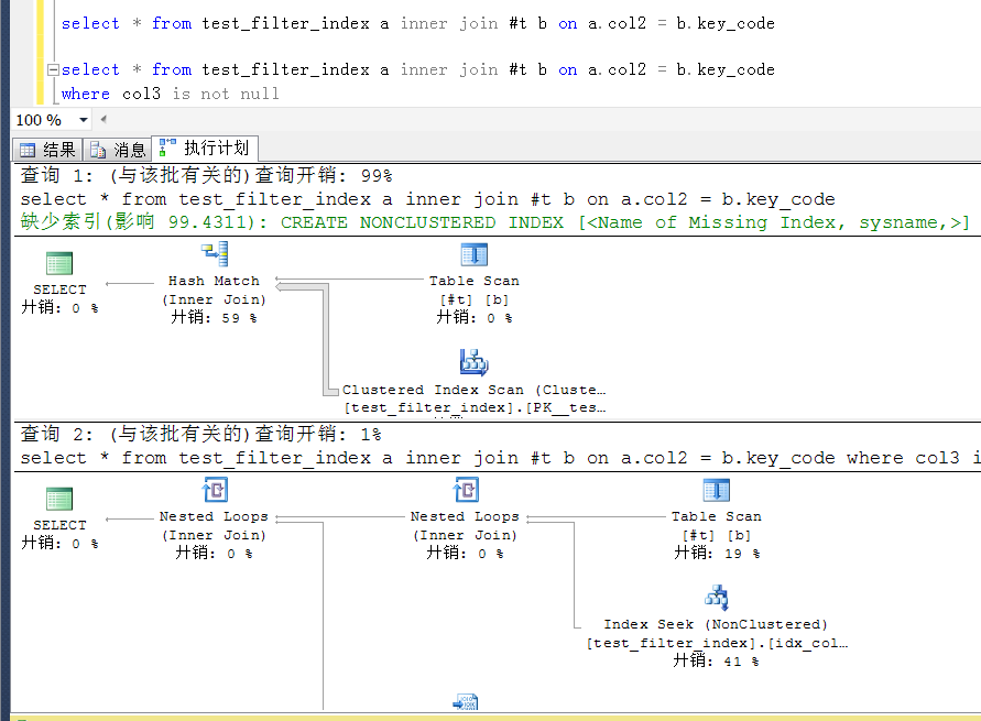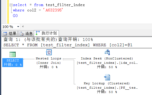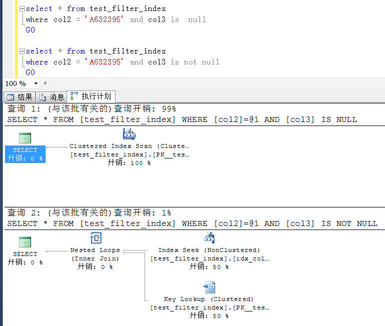 --删除之前创建的索引 drop index idx_col2 on test_filter_index --col2和col3上,如果是筛选索引(增加col2和col3上的筛选条件) create index idx_col2 on test_filter_index(col2,col3) where col2 is not null and col3 is not null GO