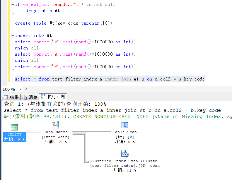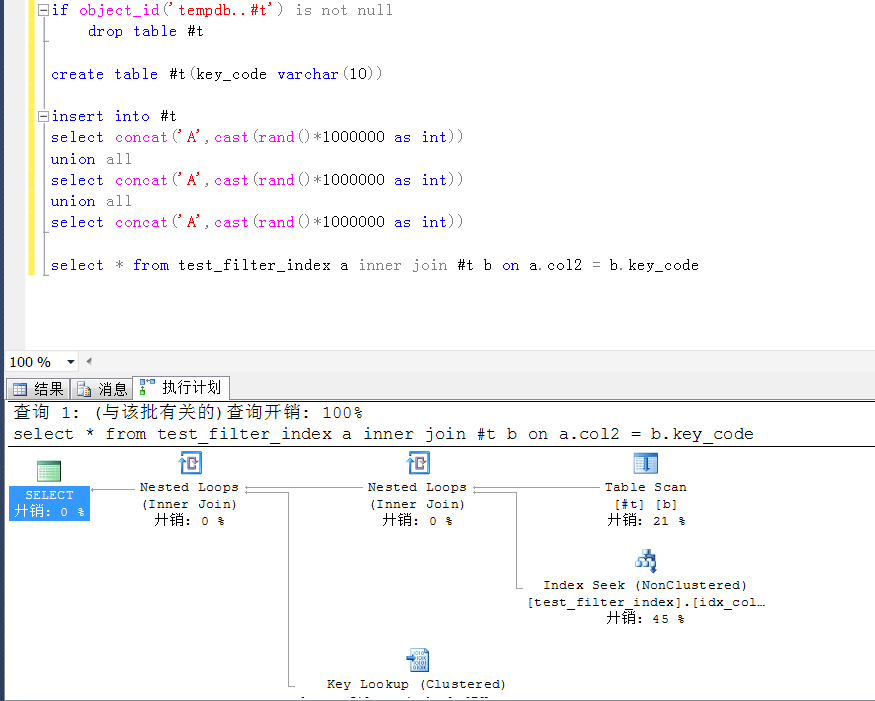if object_id('test_filter_index') is not null drop table test_filter_index GO create table test_filter_index ( id int identity(1,1) not null primary key, col2 varchar(10), col3 varchar(10), create_date datetime ) GO --写入10W行测试数据,col2 col3非空 insert into test_filter_index select concat('A',cast(rand()*1000000 as int)),concat('B',cast(rand()*1000000 as int)),getdate() GO 100000 --写入1W行测试数据,col2 col3为空 insert into test_filter_index select null,null,getdate() GO 10000