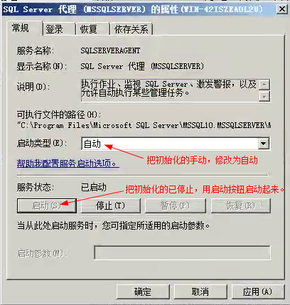 右侧找到名称为“SQL Server 代理 (MSSQLSERVER)”的一个服务,双击打开,然后设置成如下图: