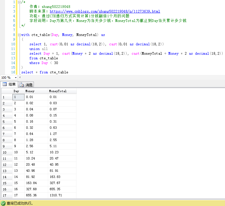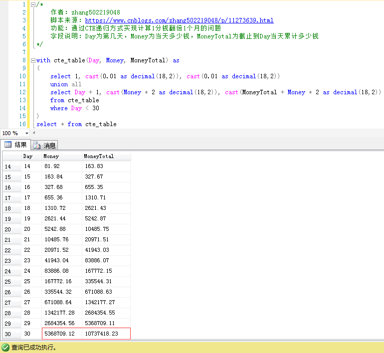 前面博主已经给大家介绍了怎么应用CTE递归方式编写简洁脚本来生成连续数字或日期(详细见博文:sql server使用公用表表达式CTE通过递归方式编写通用函数自动生成连续数字和日期),今天博主就继续为大家介绍通过CTE递归方式实现计算1分钱翻倍1个月(即:1分钱连续1个月每天翻1倍)的问题。