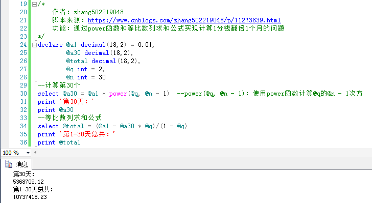 sql server编写简洁脚本求解一天存一分钱每天两倍持续一个月的问题,