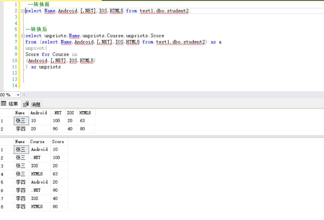 UNPIVOT运算符通过将列旋转到行来执行PIVOT的反向操作,UNPIVOT 并不完全是 PIVOT 的逆操作。 PIVOT 执行聚合,并将多个可能的行合并为输出中的一行。UNPIVOT 不重现原始表值表达式的结果,因为行已被合并。 另外,UNPIVOT 输入中的 NULL 值也在输出中消失了。如果值消失,表明在执行 PIVOT 操作前,输入中可能就已存在原始 NULL 值。