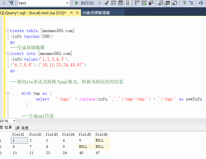 create table [maomao365.com] (info varchar(200)) go ---生成基础数据 insert into [maomao365.com] (info)values('1,2,3,4,5'), ('6,7,8,9'),('10,11,23,24,45,67') go ---使用cte表达式转换为xml格式,转换为相应的列信息 ; with tmp as ( select '<tmp>' + replace(info,',','</tmp><tmp>') + '</tmp>' as newInfo from [maomao365.com] ) ---生成xml信息 select convert(xml,newInfo).value('tmp[1]','int') as field1, convert(xml,newInfo).value('tmp[2]','int') as field2, convert(xml,newInfo).value('tmp[3]','int') as field3, convert(xml,newInfo).value('tmp[4]','int') as field4, convert(xml,newInfo).value('tmp[5]','int') as field5, convert(xml,newInfo).value('tmp[6]','int') as field6 from tmp go truncate table [maomao365.com] drop table [maomao365.com]