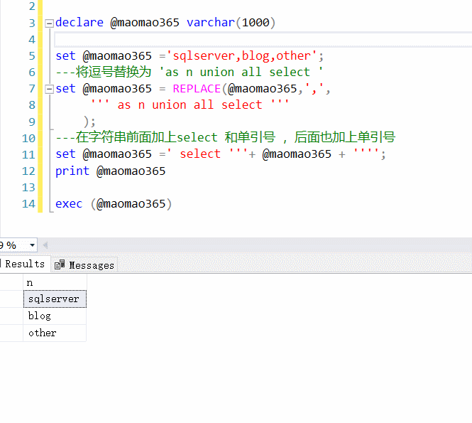 declare @maomao365 varchar(1000) set @maomao365 ='sqlserver,blog,other'; ---将逗号替换为 'as n union all select ' set @maomao365 = REPLACE(@maomao365,',', ''' as n union all select ''' ); ---在字符串前面加上select 和单引号 ,后面也加上单引号 set @maomao365 =' select '''+ @maomao365 + ''''; print @maomao365 exec (@maomao365)