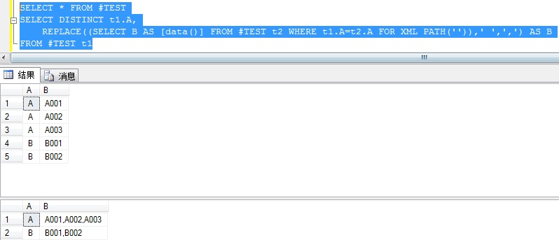 REPLACE((SELECT B AS [data()] FROM #TEST t2 WHERE t1.A=t2.A FOR XML PATH('')),' ',',') AS B