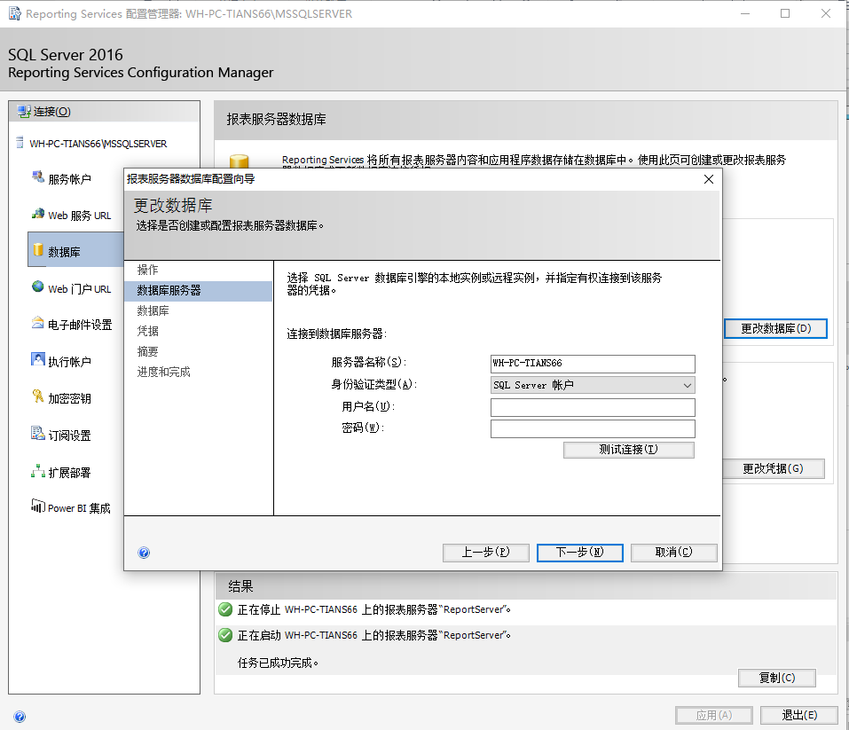 2.选择数据库》-点击更改数据库,这里是配置报表服务器的数据库,用来存储SSRS的一些配置,报表的元数据等等中间组件,可以是有权限的远程数据库。