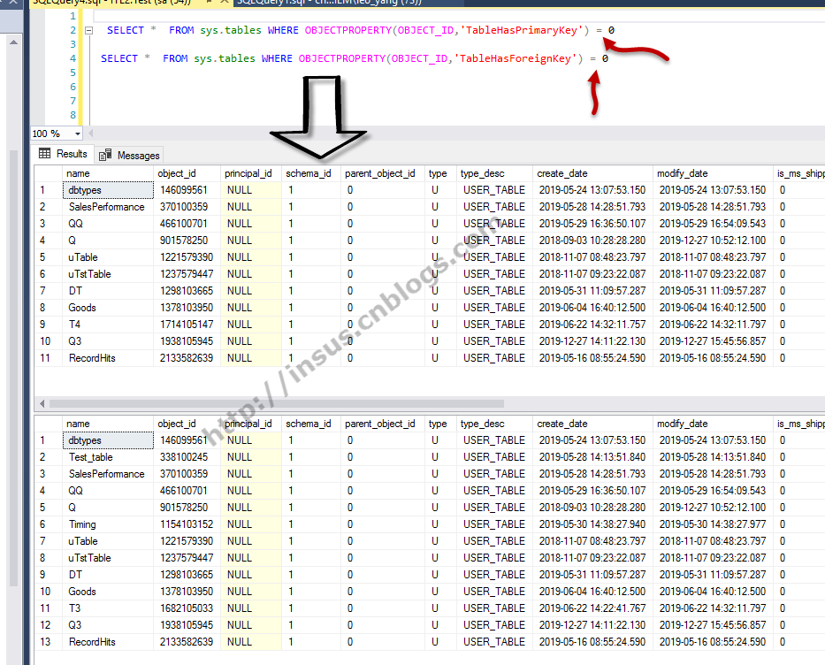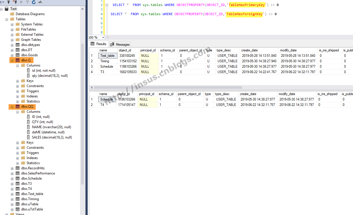 使用TableHasPrimaryKey或TableHasForeignKey来知道表是否有主键或外键, 从下面2句SQL语句执行来看, SELECT * FROM sys.tables WHERE OBJECTPROPERTY ( OBJECT_ID , ' TableHasPrimaryKey ' ) 0 SELECT * FROM sys.tables WHERE...