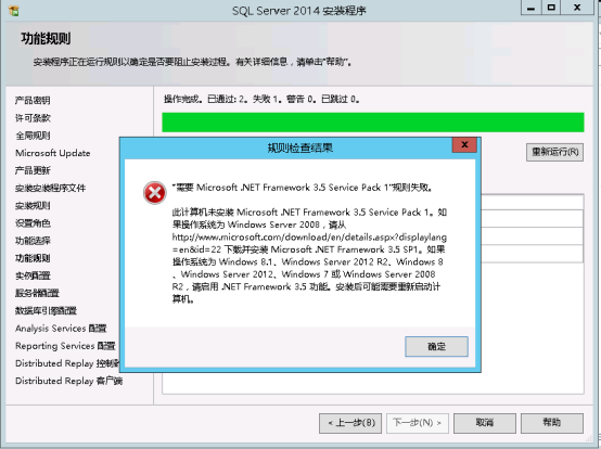 3.上边的隐患报错了,“需要microsoft .net framework 3.5 service pack 1规则失败”这里可以下载一个framework 3.5的插件,这里解释一下网上有的教程直接打开“程序和功能->启用或关闭windows功能->将未勾选的 .NET Framework 3.5 选中”,这里如果行不通,是自己电脑本身就没有安装这个插件,就要给自己的windows下载一个插件