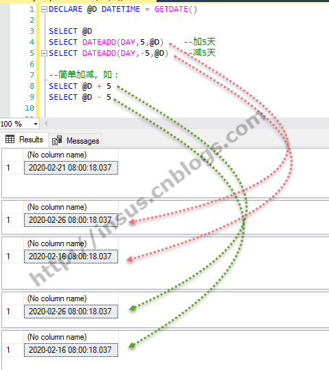 日期简单加或减, 数据库日期简单加或减: DECLARE @D DATETIME = GETDATE () SELECT @D SELECT DATEADD ( DAY , 5 , @D ) -- 加5天 SELECT DATEADD ( DAY , - 5 , @D ) -- 减5天 -- 简单加减,如: SELECT @D + 5 SELECT @D -...