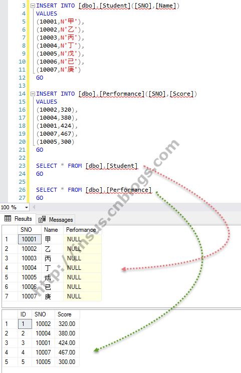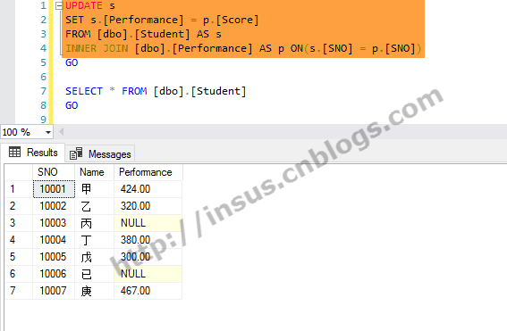 表关联使用INNER JOIN实现更新功能, 准备一些数据,创建2张表,表1为学生表: CREATE TABLE [ dbo ] . [ Student ] ( [ SNO ] INT NOT NULL PRIMARY KEY , [ Name ] NVARCHAR ( 10 ) NOT NULL , [ Performance ] DECIMAL ( 18...