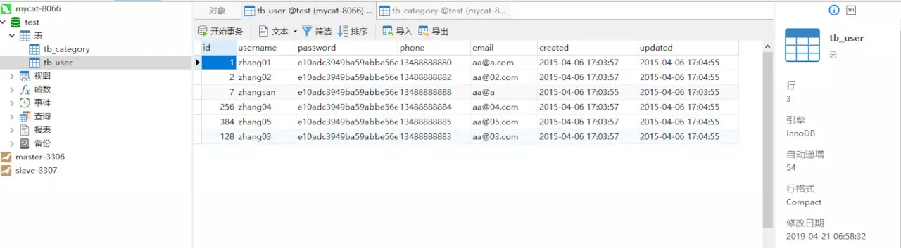 使用navicate连接mycat,端口8066(9066为管理端口)