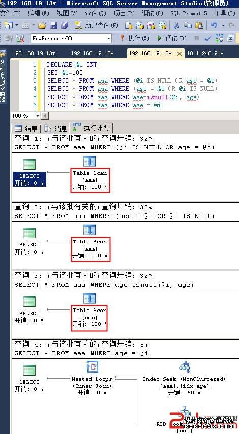可以看到,即使@i有值,不管@i IS NULL是放在前面还是放在后面,都无法用到age的索引,另外age=ISNULL(@i,age)也用不上索引