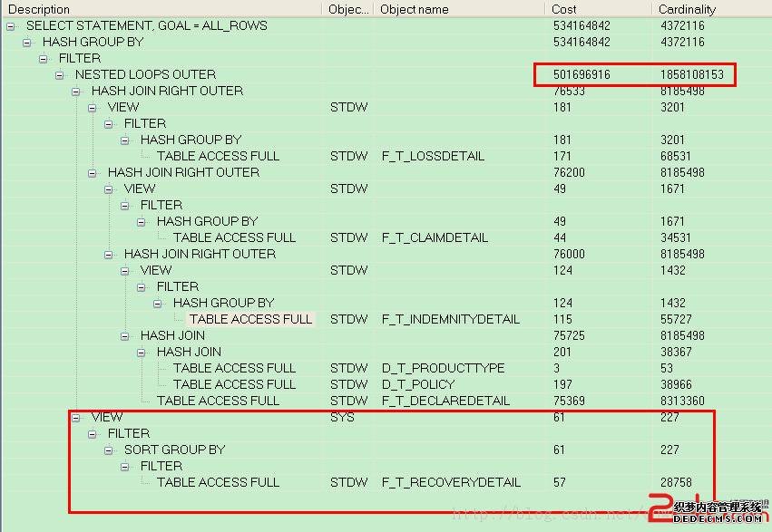 根据图示,可以比较清楚的看到,表f_t_recoverydetail居然与其他的表做了内嵌循环关联,不可思议啊,而且返回的结果集,远超百万数量级,比f_t_declaredetail的数量级还大。起初以为是统计信息出了问题,查看了各表的统计信息,发现没有什么异常。