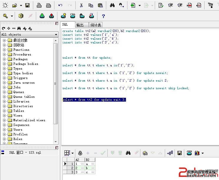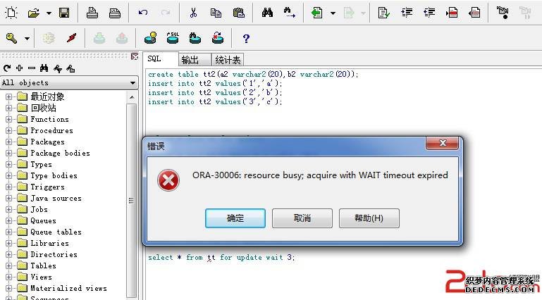 select * from tt for update wait 3;试图锁定tt表,3秒后抛出“ORA-30006: 资源已被占用;执行操作时出现WAIT 超时”的错误