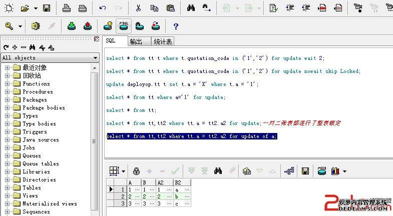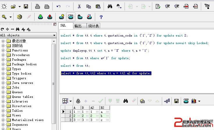 可以得到结论,for update of columns 用在多表连接锁定时,可以指定要锁定的是哪几张表,而如果表中的列没有在for update of 后面出现的话,就意味着这张表其实并没有被锁定,其他用户是可以对这些表的数据进行update操作的。这种情况经常会出现在用户对带有连接查询的视图进行操作场景下。用户只锁定相关表的数据,其他用户仍然可以对视图中其他原始表的数据来进行操作。
