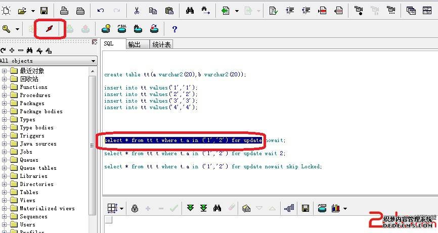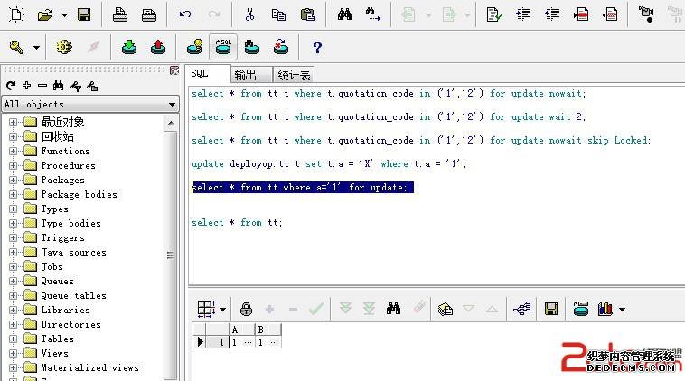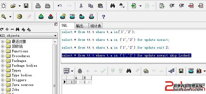 别的事务要对这个表进行写操作时,是等待一段时间还是马上就被数据库系统拒绝而返回。制定采用nowait方式来进行检索,所以当发现数据被别的session锁定中的时候,就会迅速返回ORA-00054错误,内容是资源正忙。所以在程序中我们可以采用nowait方式迅速判断当前数据是否被锁定中,如果锁定中的话,就要采取相应的业务措施进行处理。