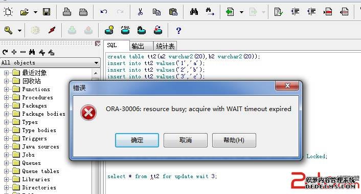 select * from tt2 for update wait 3;试图锁定tt2表,3秒后抛出“ORA-30006: 资源已被占用;执行操作时出现WAIT 超时”的错误