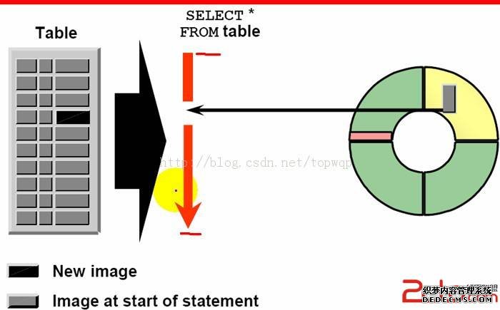当oracle开启一个事务对table表中的数据进行修改,修改的那个数据(行数据)会被拷贝到 右图 undo segment(用圆形表示是因为表示会被覆盖)中,这个时候事务没有提交,在这个时候查询table中的数据,进行全部查询的时候, 当进行全表扫描 扫描到 被事务修改的数据时候,oracle发现这是一条在事务中没有提交的数据,就会到 对应的