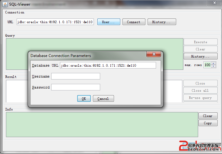5. 从Explorer的“Open DB...”按钮进入,点击“User...”按钮,此时Database URL文本框中已经自动载入了配置文件中设置的值,还需要设置数据库连接的用户名(Username)和密码(Password)。