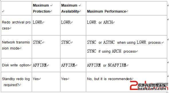 无论使用哪种模式,都要使用LOG_ARCHIVE_DEST_n来配置,上表显示它们之间的关系。可以看出,最大保护和最高可用性的配置一模一样(因为最高可用性在正常情况下就是最大保护):必须使用LGWR进程传输Redo,网络传输模式必须是sync,磁盘写选项AFFIRM,必须配置standby redo log。