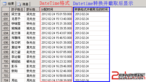 select sr_child as '孩子姓名', sr_parents as '家长姓名' ,ss_updatetime as '分配时间', left(ss_updatetime,CHARINDEX(' ',ss_updatetime)-1),SUBSTRING(CONVERT(CHAR(19), ss_updatetime, 120),1,10)as '转换格式并截取后的时间'from dbo.tb_sell_resources,dbo.tb_sell_selldetails where sr_id = ss_rsid and ss_qdstate <> 1 order by ss_updatetime