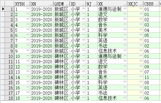 1 select * from (select xn,qxdm,nj,xk,gxsj,cbbb from test) t pivot( 2 max(t.cbbb) for xk in ( 3 '道德与法制' as 道德与法制, 4 '语文' as 语文, 5 '数学' as 数学, 6 '音乐' as 音乐, 7 '美术' as 美术, 8 '科学' as 科学, 9 '英语' as 英语, 10 '书法' as 书法, 11 '信息技术' as 信息技术 12 ) ) where 1=1