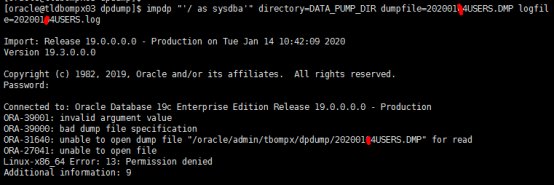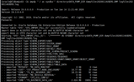 [oracle@tldbompx03 ~]$ impdp "'/ as sysdba'" directory=DATA_PUMP_DIR dumpfile=20200114USERS.DMP logfile=20200114USERS.log